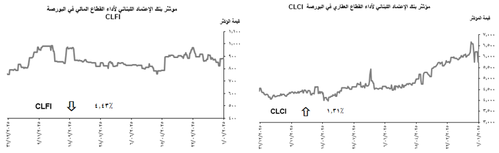 أمّا في القطاع المصرفي، فقد إستحوذت الأسهم العاديّة التابعة لبنك بيبلوس على حصّة الأسد (58.43%) من مجموع عدد الأسهُم المتداوَلة خلال الأسبوع المعني. من جهته، أنهى مؤشِّر بنك الإعتماد اللبناني لأداء القطاع المالي في البورصة (“CLFI”) أسبوعه متراجعاً بنسبة 4.43% عن إقفال الأسبوع السابق ليستقرّ عند مستوى 755.74 في ظلّ إنخفاض سعر الأسهم المدرجة التابعة لبنك لبنان والمهجر بنسبة 13.19% إلى 6.25 د.أ. ما طغى على إرتفاع سعر شهادات الإيداع التابعة لبنك لبنان والمهجر بنسبة 4.35% إلى 6.00 د.أ.