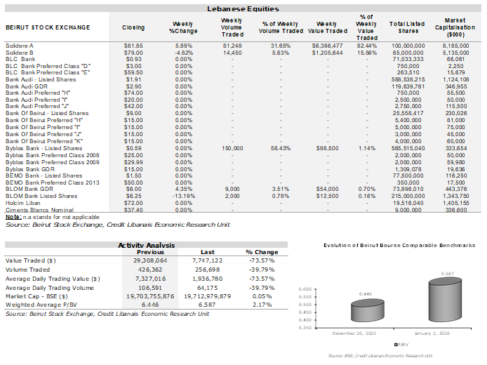 Activity on the Beirut Stock Exchange (BSE) was shy during the week of January 2 amid end of year holidays with the number of shares changing hands dropping to 256,698 shares compared to 426,362 shares in the week before and value traded decreasing to $7.75 million compared to $29.31 million a week earlier. Trades were concentrated in banking sector stocks, which accounted for 62.72% of weekly traded volume.