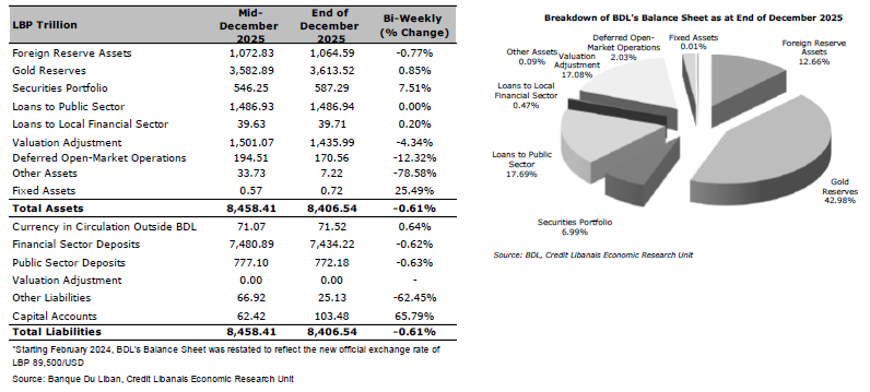 In a related note, BDL’s balance sheet witnessed major changes during the two-week period ending December 2025 with total assets dropping by 0.61% to LBP 8,406.54 trillion. In details, other assets contracted by 78.58% to LBP 7.22 trillion, deferred market operations decreased by 12.32% to LBP 170.56 trillion, the valuation adjustment account dropped by 4.34% to LBP 1,435.99 trillion, while the securities portfolio rose by 7.51% to LBP 587.29 trillion. On the liabilities side, BDL’s other liabilities contracted by 62.45% to LBP 25.13 trillion while capital accounts increased by 65.79% to LBP 103.48 trillion.