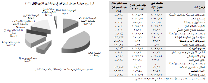 تُظهِر ميزانيّة مصرف لبنان إنخفاض في الموجودات الخارجيّة بالعملات الأجنبيّة بمبلغٍ قدره 92.14 مليون د.أ. (0.77%) خلال النصف الثاني من شهر كانون الأوّل 2025 إلى 11.89 مليار د.أ. (1،064.59 ترليون ل.ل.)، مقارنةً مع 11.99 مليار د.أ. (1،072.83 ترليون ل.ل.) قبل فترة أسبوعين. يجدر الذكر أنّ الموجودات الخارجيّة بالعملات الأجنبيّة لدى مصرف لبنان قد شهدت زيادة مضطردة خلال الفترة الممتدّة بين بداية شهر آب 2023 (أيّ عند نهاية ولاية الحاكم السابق رياض سلامة) ونهاية شهر كانون الأوّل 2025 بلغت قيمتها الإجماليّة حوالي 3.32 مليار د.أ. عقب سياسة مصرف لبنان النقديّة الجديدة القاضية بالإمتناع عن تسليف الحكومة ورفع الدعم عن معظم السلع والحدّ من طبع العملة المحليّة. في السياق عينه، زادت الموجودات الخارجيّة بالعملات الأجنبيّة لدى مصرف لبنان بحوالي 1.76 مليار د.أ. خلال العام 2025. من جهةٍ أخرى، تُبيِّن ميزانيّة مصرف لبنان زيادة في قيمة إحتياطاته من الذهب بلغت نسبتها 0.85% (0.34 مليار د.أ.) في النصف الثاني من شهر كانون الأوّل 2025 إلى 40.37 مليار د.أ. (3،613.52 ترليون ل.ل.) في ظلّ إرتفاع أسعار الذهب إلى أعلى مستوى تاريخي لها نتيجة ترقّب الأسواق لقيام الإحتياطي الفيديرالي بمزيد من التخفيضات على الفوائد في العام 2026.