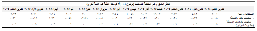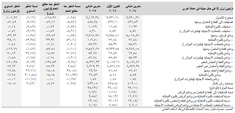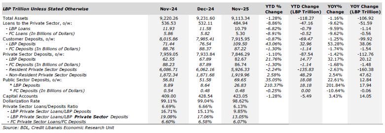 في المقلب الآخر، إنكمشت تسليفات المصارف اللبنانيّة إلى القطاع الخاصّ (المقيمين وغير المقيمين) بنسبة 8.86% (47.16 ترليون ل.ل.) خلال الأشهر الإحدى عشر الأولى من العام 2025 إلى 484.94 ترليون ل.ل. مقابل 532.11 ترليون ل.ل. في نهاية العام 2024. بالتفاصيل، فقد تراجعت التسليفات المعنونة بالليرة اللبنانيّة بنسبة 6.82% (0.79 ترليون ل.ل.) خلال الأشهر الإحدى عشرة الأولى من العام 2025 إلى 10.79 ترليون ل.ل.، كما وإنخفضت التسليفات المعنونة بالعملات الأجنبيّة بنسبة 8.91% (518.15 مليون د.أ.) إلى 5.30 مليار د.أ. على صعيد شهري، إرتفعت التسليفات المعنونة بالليرة اللبنانيّة ب0.62 ترليون ل.ل. في حين إنخفضت تلك المعنونة بالعملات الأجنبيّة ب49.31 مليون د.أ وقد وصل معدّل التسليفات من ودائع الزبائن إلى 6.13% في نهاية شهر تشرين الثاني 2025، مقابل 6.66% في نهاية العام 2024 و6.69% في نهاية شهر تشرين الثاني 2024. في التفاصيل، وصلت نسبة التسليفات إلى القطاع الخاصّ المعنونة بالليرة اللبنانيّة من مجموع الودائع المعنونة بالعملة الوطنيّة إلى 9.85% في شهر تشرين الثاني 2025، مقارنةً مع 15.13% في نهاية العام 2024 و16.71% قبل عام كما وإنخفض معدّل التسليفات المعنونة بالعملات الأجنبيّة إلى 6.07% من مجموع الودائع بالعملات الأجنبيّة، من 6.58% في نهاية العام 2024 و6.60% في تشرين الثاني 2024. على صعيد سنوي، إنكمشت محفظة التسليفات بنسبة 9.62% (51.59 ترليون ل.ل.) عند مقارنتها بالمستوى الذي كانت عليه في شهر تشرين الثاني 2024 والبالغ حينها 536.53 ترليون ل.ل.