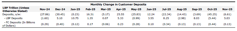 On the funding side of the balance sheet, customer deposits dropped by 0.87% (LBP 69.47 trillion) YTD November 2025 to LBP 7,915.95 trillion with resident private sector deposits decreasing by 2.24% (LBP 135.83 trillion) to LBP 5,926.33 trillion, non-resident private sector deposits increasing by 2.58% (LBP 48.29 trillion) to LBP 1,919.96 trillion, and public sector deposits rallying by 35.05% (LBP 18.08 trillion) to LBP 69.65 trillion. From a currency denomination standpoint, deposits in Lebanese Pounds rose by 43.06% (LBP 32.96 trillion) YTD November to LBP 109.50 trillion while foreign currency deposits dropped by 1.30% ($1.14 billion) to $87.22 billion. On a monthly basis, LBP deposits increased by LBP 5.03 trillion in November with FC deposits decreasing by $130.07 million. In this context, the deposit dollarization rate reached 98.62% at end of November 2025 in comparison with 99.04% at end of year 2024 and 99.11% in November 2024. On an annual basis, total customer deposits narrowed by 1.25% (LBP 99.92 trillion) from a reading of LBP 8,015.86 trillion at end of November 2024.