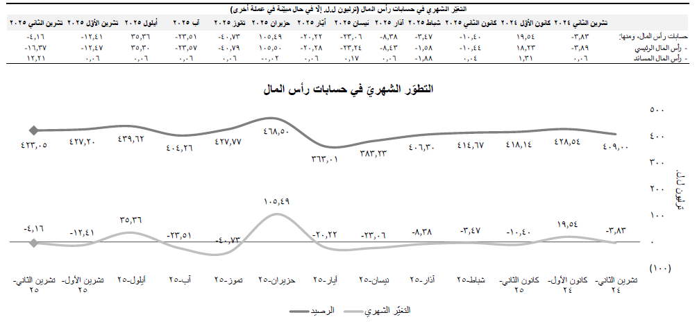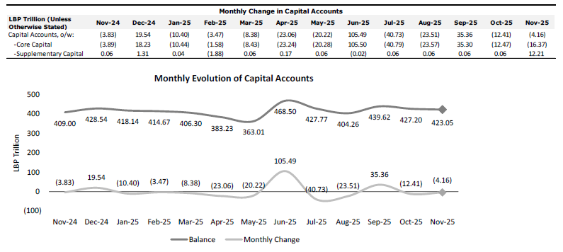 The combined capital accounts of commercial banks operating in Lebanon decreased by 1.28% (the equivalent of $61.34 million or the counter value of LBP 5.49 trillion) in the first eleven months of 2025 to LBP 423.05 trillion ($4.73 billion) from LBP 428.54 trillion ($4.79 billion) at end of year 2024. On a monthly basis, the combined capital accounts decreased by LBP 4.16 trillion ($46.46 million) in November after having dropped by LBP 12.41 trillion ($138.71 million) in October. The monthly decrease in the capital accounts of the resident banking sector owes to some LBP 16.37 trillion drop in core capital which totally wiped out the LBP 12.21 trillion increase in supplementary capital. On an annual basis however, the combined equity of the resident banking sector rose by 3.43% (LBP 14.05 trillion, around $0.16 billion) when benchmarked to the LBP 409.00 trillion ($4.57 billion) reading reported at end of November 2024.