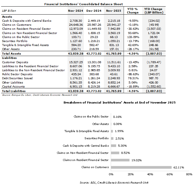 According to Banque Du Liban (BDL) statistics, the consolidated balance sheet of financial institutions operating in Lebanon narrowed by 4.59% (LBP 2,007.03 billion) in the first eleven months of 2025 to LBP 41,765.99 billion, down from LBP 43,773.02 billion at year-end 2024. This can be attributed to the 30.63% (LBP 3,507.03 billion) decrease in claims on the resident financial sector to LBP 7,942.89 billion, coupled with the 9.55% (LBP 234.02 billion) drop in cash & deposits with central banks to LBP 2,215.18 billion and the 13.79% (LBP 168.00 billion) decrease in the value of securities portfolio to LBP 1,050.21 billion, which altogether outweighed the 93.68% (LBP 1,722.04 billion) rise in claims on the non-resident financial sector to LBP 3,560.19 billion, the 42.69% (LBP 248.66 billion) increase in the value of fixed assets to LBP 831.13 billion, and the 133.09% (LBP 38.90 billion) increase in claims on the public sector to LBP 68.13 billion. It is worth noting that claims on customers and claims on the resident financial sector are the two largest asset categories on financial institutions’ balance sheet, accounting for 62.11% and 19.02% of total assets on a respective basis. On the liabilities side, financial institutions’ customer deposits dropped by 13.45% (LBP 1,789.47 billion) YTD November 2025 to LBP 11,511.61 billion, with capital accounts decreasing by 18.89% (LBP 1,552.60 billion) to LBP 6,666.67 billion and public sector deposits plummeting by 88.63% (LBP 340.07 billion) to LBP 43.61 billion, totally eroding the 78.31% (LBP 987.70 billion) increase in the value of issued debt securities to LBP 2,248.93 billion, the 5.06% (LBP 426.00 billion) rise in other liabilities to LBP 8,852.14 billion, and the 2.58% (LBP 237.35 billion) increase in liabilities to the resident financial sector to LBP 9,433.10 billion only to name a few.
