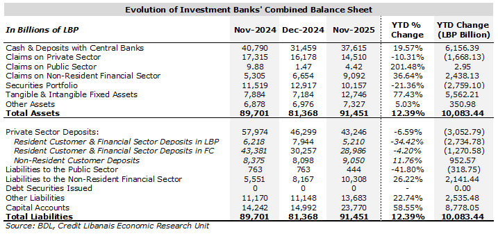According to Banque Du Liban (BDL) statistics, the combined balance sheet of investment banks operating in Lebanon widened by 12.39% (LBP 10,083.44 billion) during the first eleven months of 2025 to LBP 91,451 billion, up from LBP 81,368 billion at end of 2024. In details, cash and deposits with Central Bank soared by 19.57% (LBP 6,156.39 billion) to LBP 37,615 billion and was accompanied by some 77.43% (LBP 5,562.21 billion) increase in the value of fixed assets to LBP 12,746 billion and some 36.64% (LBP 2,438.13 billion) rise in claims on the non-resident financial sector to LBP 9,092 billion among others, which together outweighed the 21.36% (LBP 2,759.10 billion) drop in the value of the securities portfolio to LBP 10,157 billion and the 10.31% (LBP 1,668.13 billion) decrease in claims on the private sector to LBP 14,510 billion. On the liabilities side, investment banks’ capital accounts soared by 58.55% (LBP 8,778.05 billion) in the first eleven months of 2025 to LBP 23,770 billion, and were accompanied by some 22.74% (2,535.48 billion) increase in other liabilities to LBP 13,683 billion and some 26.22% (LBP 2,141.44 billion) rise in liabilities to the non-resident financial sector to LBP 10,308 billion, which eroded the 6.59% (LBP 3,052.79 billion) decrease in private sector deposits (resident and non-resident deposits in addition to resident financial sector deposits) to LBP 43,246 billion and the 41.80% (LBP 318.75 billion) drop in liabilities to the public sector to LBP 444 billion.