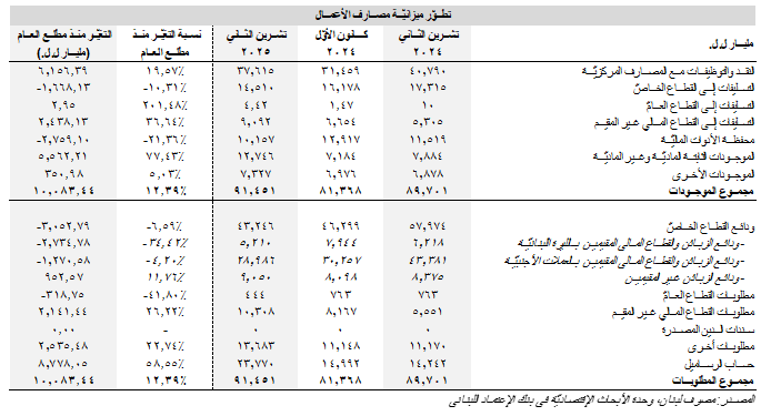 مراعاةً لتوصيات المصرف المركزي، نجحت مصارف الأعمال خلال السنوات القليلة المنصرمة بتعزيز محفظة تسليفاتها إلى القطاع الخاصّ مقابل توظيفاتها مع القطاع العامّ، مسجِّلةً فائضاً بقيمة 14،505 مليار ل.ل. مع نهاية شهر تشرين الثاني 2025 مقارنةً ب16،177 مليار ل.ل. في نهاية العام 2024.