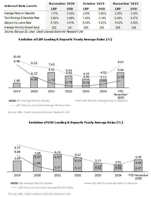 According to BDL statistics, the average interest rate on Lebanese Pound denominated deposits rose to 3.25% during the eleventh month of 2025, up from 2.91% in the previous month, noting that it stood at 1.17% in November 2024. Similarly, the average interest rate on U.S. Dollar denominated deposits increased to 0.12% in November 2025, up from 0.06% in October of the same year noting that it stood at 0.03% in November 2024. Commercial banks’ discount and lending rate on LBP denominated loans rose to 11.42% in November 2025 (9.24% in October), with that on USD denominated loans concurrently increasing to 5.32% (4.23% in October). Consequently, the average monthly spread between LBP lending and deposit rates widened to 586 basis points in the first eleven months of 2025 (563 bps YTD October), with that between USD lending and deposit rates increasing to 438 bps (430 bps by October).
