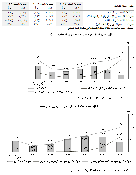 بحسب إحصاءات مصرف لبنان، إرتفع متوسّط الفائدة على الودائع المعنونة بالليرة اللبنانيّة إلى 3.25% خلال الشهر الحادي عشر من العام 2025، من 2.91% في الشهر الذي سبقه، علماً أنّه كان قد إستقرّ عند مستوى 1.17% في شهر تشرين الأوّل من العام 2024. من جهةٍ أخرى، زاد متوسّط الفائدة على الودائع بالدولار الأميركي إلى 0.12% في شهر تشرين الثاني 2025 من 0.06% في شهر تشرين الأوّل من العام نفسه، علماً أنّه كان قد وصل إلى 0.03% في شهر تشرين الثاني من العام 2024. في إطارٍ متصّل، إرتفع متوسّط الفائدة على التسليفات المُعَنونة بالليرة اللبنانيّة إلى 11.42% في شهر تشرين الثاني 2025 (9.24% في تشرين الأوّل)، كما وزاد متوسّط الفائدة على التسليفات المُعَنونة بالدولار الأميركي إلى 5.32% (4.23% في تشرين الأوّل). نتيجةً لذلك، إتّسع متوسّط الهامش الشهري إلى 586 نقطة أساس ما بين التسليفات والودائع بالليرة اللبنانيّة كما في نهاية الأشهر الإحدى العشر الأولى من العام 2025 (563 نقطة أساس حتّى شهر تشرين الأوّل) كما وزاد إلى 438 نقطة أساس ما بين التسليفات والودائع بالدولار الأميركي (430 نقطة أساس لغاية شهر تشرين الأوّل).