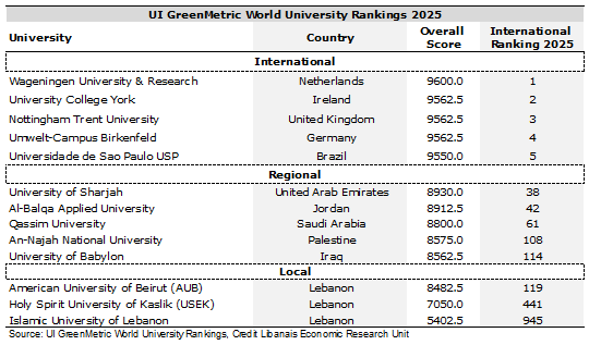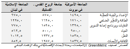 محلّياً، تبوّأت الجامعة الأميركيّة في بيروت المركز الأوّل والمرتبة 119 عالميّاً بنتيجة 8482.5، تبعتها جامعة الروح القدس - الكسليك (نتيجة إجماليّة: 7050.0، تصنيف عالمي: 441)، والجامعة الإسلاميّة في لبنان (نتيجة إجماليّة: 5402.5، تصنيف عالمي: 945). وبالتفصيل، تفوّقت الجامعة الأميركيّة في بيروت على الجامعات الأُخرى في لبنان في خمسة معايير ألا وهي الإعداد والبنية التحتيّة (النتيجة: 1425.0)، والطاقة والتغيّر المناخي (النتيجة 1710.0) والمحافظة على المياه (النتيجة: 950.0) وسياسات النقل (النتيجة: 1535.0)، والثقافة والأبحاث (النتيجة: 1537.5). من جهةٍ أخرى، أتت جامعة الروح القدس – الكسليك في المرتبة الأولى بين جامعات لبنان المشمولة في التقرير في معيار التخلّص من النفايات وإعادة تدويرها (النتيجة: 1525.0).