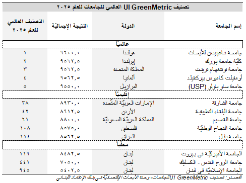 وقد تصدّرت جامعة فاغينينغن في هولندا قائمة UI GreenMetric للجامعات حول العالم للعام 2025 بنتيجة 9600.0، تلتها كلٍّ من كليّة جامعة يورك – إيرلندا وجامعة نوتنغهام ترينت – المملكة المتّحدة وجامعة أومفيلت كامبوس بيركنفيلد – ألمانيا (نتيجة 9562.5 لكلٍ منهما)، وجامعة ساو باولو (USP) – البرازيل (نتيجة 9550.0).