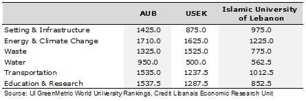 Locally, the American University of Beirut (AUB) topped the list of Lebanese Universities in the UI GreenMetric rankings with a score of 8482.5 and an international rank of 119, followed by the Holy Spirit University of Kaslik (USEK) (overall score: 7050.0; international rank: 441) and the Islamic University of Lebanon (overall score: 5402.5; international rank: 945). In detail, AUB outperformed other universities in Lebanon in five criteria, namely Setting & Infrastructure (score: 1425.0), Energy & Climate Change (score: 1710.0), Water Conservation (score: 950.0), Transportation (score: 1535.0), and Education & Research (score: 1537.5). USEK, on the other hand, outperformed Lebanese universities when it comes to the Waste & Recycling Programs criteria (score: 1525.0).