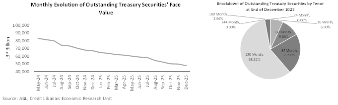 According to the ABL’s monthly Treasury Bills publication, the face value of the outstanding LBP treasury securities’ portfolio fell by 4.07% in December 2025 to LBP 47,847 billion, down from LBP 49,877 billion a month earlier, with the balance of outstanding treasury securities that matured since the beginning of the year 2025 and up until December reaching LBP 19,319 billion. In this respect, the outstanding face value of LBP treasury securities dropped by 28.76% year-on-year when compared to the LBP 67,165 billion outstanding level at end of December 2024. The continuous drop in the outstanding balance of the face value of the treasury securities portfolio may be explained by the Ministry of Finance’s decision to suspend the issuance of new securities since December 2023. It is worth highlighting that 58.32% of the outstanding treasury securities’ portfolio had a tenor of 120 months as at end of December 2025, followed by the 84 month (21.96%), 60 month (9.86%) and 36 month (6.90%) tenor securities.