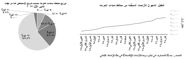 بحسب إحصاءات جمعيّة المصارف، تراجعت محفظة سندات الخزينة بنسبة 4.07% في شهر كانون الأوّل 2025 إلى 47،847 مليار ل.ل. من 49،877 مليار ل.ل. في شهر تشرين الثاني ليصل رصيد سندات الخزينة المستحقّ منذ بداية العام 2025 ولغاية شهر كانون الأوّل إلى 19،319 مليار ل.ل. بذلك، تكون قد تراجعت محفظة سندات الخزينة القائمة بنسبة 28.76% على صعيد سنويّ من 67،165 مليار ل.ل. في شهر كانون الأوّل من العام 2024. ويأتي هذا التراجع المستمرّ في القيمة الإسميّة لهذه المحفظة في ظلّ توقّف وزارة المال عن إصدار سندات جديدة منذ شهر كانون الأول 2023. وقد شكّلت سندات الخزينة التي تبلغ مدّة إستحقاقها 120 شهراً حصّة الأسد (58.32%) من الرصيد المتبقّي لسندات الخزينة بالليرة اللبنانيّة كما في نهاية شهر كانون الأوّل 2025، تلتها تلك من فئة ال84 شهراً (حصّة 21.96%) وتلك من فئة ال60 (9.86%) وال36 (6.90%) شهراً للذكر لا للحصر.