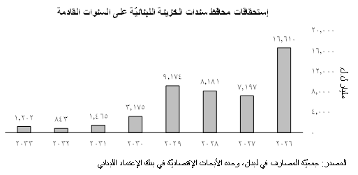 ومن المتوقّع بأن يشهد العام 2026 إستحقاق سندات بقيمة 16،609 مليار ل.ل. (34.7%) وإستحقاق سندات بقيمة 7،197 مليار ل.ل. (15.0%) في العام 2027 وإستحقاق بقيمة 8،182 مليار ل.ل. (17.1%) في العام 2028. يظهر البيان التالي توزيع إستحقاقات سندات الخزينة اللبنانيّة خلال الفترة الممتدّة بين العامين 2026 و2033: