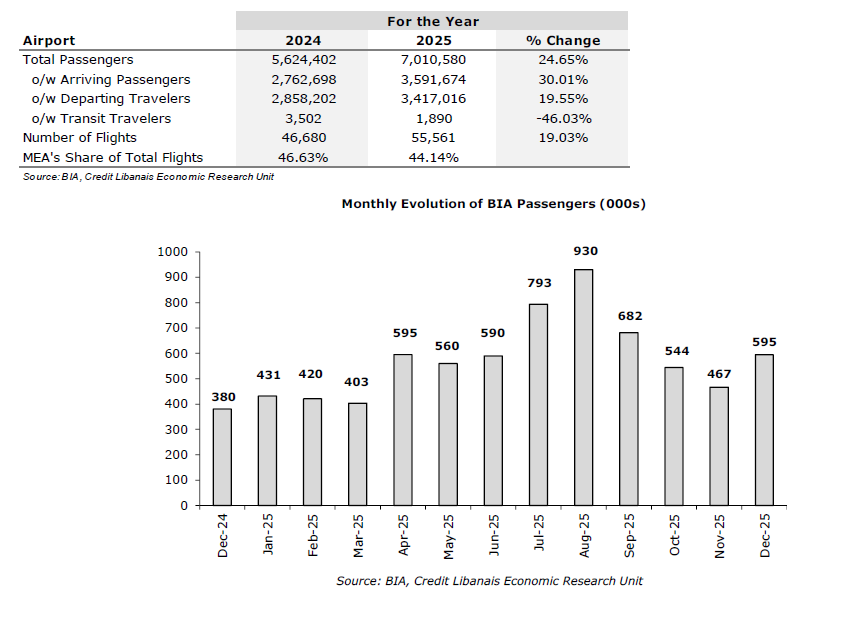 The number of passengers via the Beirut International Airport (BIA) stood at 594,705 in December 2025, up by 27.32% month-on-month from 467,099 in November and came in 56.54% higher y-o-y when compared to December 2024’s shy reading of 379,910 as a result of the Israeli aggression on Lebanon in the last quarter of 2024. The ratio of departing to arriving passengers attained 0.76x in December compared to 1.09x in November, 1.07X in October and 1.30x in September. On a cumulative basis, the number of BIA passengers rose by 24.65% in the full year 2025 to around 7.01 million up from 5.62 million passengers in 2024. More specifically, the number of arriving travelers increased by 51.33% m-o-m and by 30.01% on an annual basis to 3.59 million in 2025, with the number of departing travelers rising by 5.37% m-o-m and by 19.55% y-o-y to 3.42 million. The number of transit travelers dropped by 21.43% m-o-m and by 46.03% y-o-y to 1,890 when compared to year 2024’s figure of 3,502. As to the number of flights, the latter saw a monthly increase of 14.72% in December and an annual rise of 19.03% during the year 2025 to 55,561. It is worth highlighting in this context that the share of Middle East Airlines (MEA) dropped from 46.63% of the total number of flights in 2024 to 44.14% in 2025. This is further sketched in the section below: