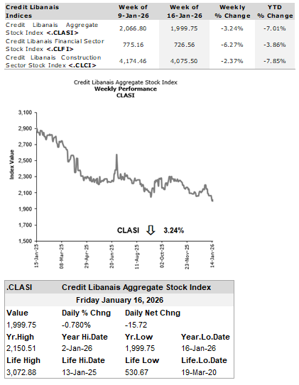 Five losing and one gaining stock were screened week-on-week, dragging the BSE’s market capitalization down by 3.13% to around $18.38 billion and the Credit Libanais Aggregate Stock Index (“CLASI”) lower by 3.24% to 1,999.75.