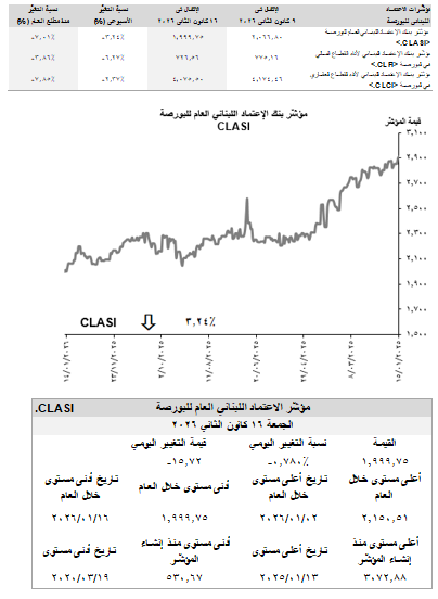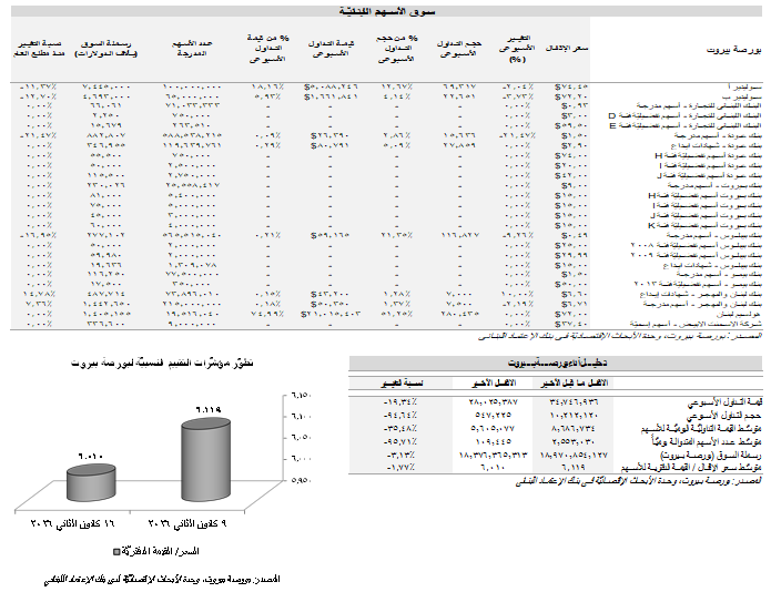 كانت حركة التداول على بورصة بيروت ضعيفة في الأسبوع المنتهي في 16 كانون الثاني حيث إنخفض عدد الأسهُم المتداوَلة إلى 547،225سهم، مقارنةً ب10،212،120 سهم في الأسبوع الذي سبقه رافقه تراجع في قيمة الأسهم المتداولة إلى 28.03 مليون د.أ.، مقارنةً ب34.75 مليون د.أ. قبل أسبوع. يمكن تعليل حركة التداول المرتفعة في الأسبوع السابق إلى تفرّغ شركة Holcibel S.A. عن كامل حصّتها في شركة هولسيم لبنان والبالغة 52.07% من مجموع عدد أسهم الشركة من خلال بورصة بيروت مقابل مبلغ 32.01 مليون د.أ. وقد سَيطَرَت أسهُم القطاع العقاري على الحصّة الأكبر من حجم التداول مشكّلةً نسبة 68.05% من مجموع عدد الأسهم المتداولة.