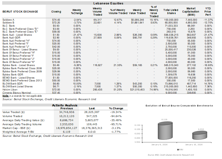 Activity on the Beirut Stock Exchange (BSE) was sluggish during the week of January 16 with the number of shares changing hands plummeting to 547,225 shares compared to 10,212,120 shares in the week before and value traded decreasing to $28.03 million compared to $34.75 million a week earlier. The sizeable trading activity of the previous week owes to the disposal of Holcibel S.A. of its entire 52.07% stake in Holcim Liban S.A.L. through the BSE against a total consideration of $32.01 million rendering as such the comparison in trading activity between the 2 consecutive weeks irrelevant. Trades were concentrated in real estate sector stocks, which accounted for 68.05% of weekly traded volume.
