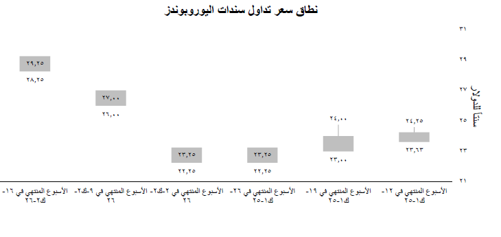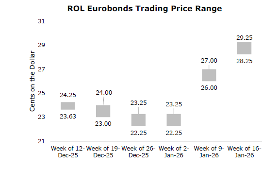 إستمرّ الطلب على سندات اليوروبوند اللبنانيّة في الإزدياد خلال الأسبوع الثاني من كانون الثاني 2026. وقد بلغت الأسعار أعلى مستوى لها في خمس سنوات عند 30 سنتاً للدولار، قبل أن تستقر عند 28.25 - 29.25 سنتاً للدولار في نهاية الأسبوع. ويعكس هذا الاهتمام المستمرّ تفاؤلاً بين المتداولين بشأن إمكانية تحسّن الوضع السياسي والإقتصادي في لبنان.