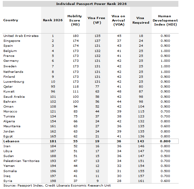 On a regional basis, Qatar came in second among its peers in the “Individual Passport Power Rank 2026”, ranking 95th in the world with a MS of 118, followed by Kuwait (global rank: 96; MS: 111), Saudi Arabia (global rank: 101; MS: 100), Bahrain (global rank: 102; MS: 100), Oman (global rank: 108; MS: 94), and Morocco (global rank: 121; MS: 83), only to name a few. Lebanon ranked 181st in the world in the Individual Passport Power Rank 2026 with a Mobility Score of 55, which indicates that a Lebanese passport-holder enjoys an easy access to a total of 55 countries, 19 of which are visa-free and 36 grant visas on arrival, in comparison with 57 countries in 2025, 60 in 2024 and 58 in 2023.