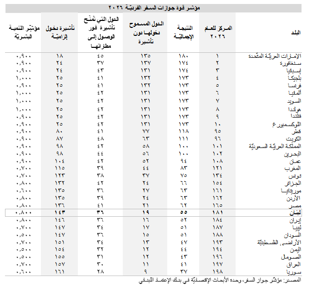 نشر مؤشِّر جواز السفر بياناته المحدّثة حول قوّة جوازات السفر الفرديّة للعام 2026. يقيّم المؤشّر حريّة السفر حول العالم إستناداً إلى عدد الإتفاقيّات المبرَمة بين البلدان بهدف إلغاء تأشيرات الدخول في 193 دولة و6 مناطق. ويعطي المؤشِّر أداةً ديناميكيّةً لجَمْع، وعَرْض، وتصنيف جوازات السفر في العالم إستناداً إلى عددٍ من الخصائص الأساسيّة المختلفة. على سبيل المثال، يَعتمِد الترتيب الفردي لكلّ جواز سفر على ثلاثة مقاييس، وهي: 1) عدد البلدان التي يمكن لحامل جواز السفر زيارتها بسهولة، بما فيها الدول المسموح دخولها بدون تأشيرة والدول التي تَمنَح تأشيرة فور الوصول إلى مطاراتها (وتَشمُل التأشيرات الإلكترونيّة)، و2) الدول المسموح دخولها دون تأشيرة كنسبةٍ من الدول التي تَمنَح تأشيرة فَور الوصول إلى مطاراتها، و3) مؤشِّر التنمية البشريّة لبرنامج الأمم المتّحدة الإنمائي للعام 2018.