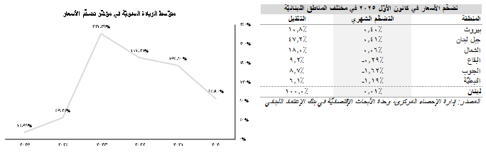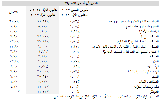 تُظهِر الإحصاءات الصادرة عن إدارة الإحصاء المركزي أنّ مؤشِّر أسعار الإستهلاك في لبنان بقي شبه مستقرّاً خلال شهر كانون الأوّل 2025 مقارنةً بزيادة بلغت نسبتها 0.82% في شهر تشرين الثاني. على صعيدٍ سنويٍّ، سَجَّلَ مؤشِّر تضخُّم الأسعار إرتفاع بلغت نسبته 12.23% إلى 7،924.35 في الشهر الأخير من العام 2025، مقارنةً بمستوى بلغ 7،061.07 في الشهر نفسه من العام 2024. وقد بلغ متوسّط الزيادة السنويّة في مؤشّر تضخّم الأسعار 14.58% في العام 2025 مقارنةً بمتوسّط زيادة بلغ 45.24% في كامل العام 2024 و221.34% في العام 2023. يمكن تعليل التباطؤ الملحوظ في معدّلات التضخّم بإنتشار دولرة السلع والخدمات وإستقرار سعر صرف الليرة اللبنانيّة مقابل الدولار الأميركي منذ شهر تمّوز 2023. بالتفاصيل، إرتفعت أسعار المواد الغذائيّة والمشروبات غير الروحيّة بنسبة سنويّة بلغت 14.64% (تثقيل بنسبة 20.0%)، رافقها زيادة بنسبة 26.18% في أسعار المسكن (القيمة التأجيريّة للمالكين؛ تثقيل بنسبة 13.6%) وبنسبة 6.00% في أسعار المسكن (الماء والغاز والكهرباء والمحروقات الأخرى) (تثقيل بنسبة 11.8%) وإرتفاع في كلفة الصحّة بنسبة 2.22% (تثقيل بنسبة 7.7%) وغلاء بنسبة 35.94% في أسعار التعليم (تثقيل بنسبة 6.6%). تجدر الإشارة إلى أنّ أسعار الألبسة والأحذية (تثقيل بنسبة 5.2%) قد إرتفعت بنسبة 1.95% على صعيدٍ سنويٍّ في شهر كانون الأوّل 2025 رافقها زيادة في أسعار المطاعم والفنادق بنسبة 7.57% (تثقيل بنسبة 2.8%) وإرتفاع أسعار الإستجمام والتسلية والثقافة (تثقيل بنسبة 2.4%) بنسبة 31.56%. من جهةٍ أخرى، كانت أسعار الإتّصالات (تثقيل بنسبة 4.5%) والأثاث والتجهيزات المنزليّة والصيانة المنزليّة (تثقيل بنسبة 3.8%) المكوّنين الوحيدين الذين شهدا تراجعاً سنويّاً في الشهر الأخير من العام 2025 حيث إنخفضت هذه الأسعار بنسبة سنويّة قدرها 0.70% و1.61% بالتتالي في كانون الأوّل. تُظهر الفقرة التالية تقلّبات أسعار البنود في مؤشِّر أسعار الإستهلاك: