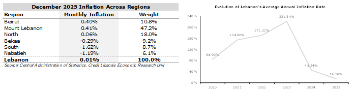 On a geographical basis, three regions across Lebanon saw a monthly rise in their CPI values in December 2025, with the sharpest increase taking place in Mount Lebanon (0.41%), followed by the Beirut (0.40%) and North (0.06%) regions.