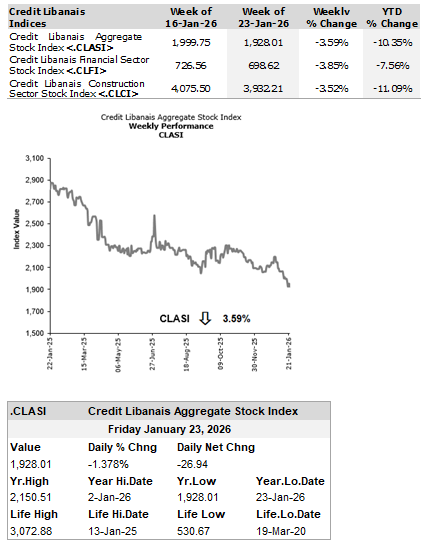 Three losing and one gaining stock were screened week-on-week, dragging the BSE’s market capitalization down by 3.46% to around $17.74 billion and the Credit Libanais Aggregate Stock Index (“CLASI”) lower by 3.59% to 1,928.01.