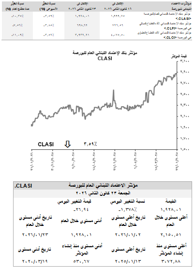 من جهةٍ أخرى، إنخفضت الرسملة السوقيّة (Market Capitalization) لبورصة بيروت بنسبة 3.46% على صعيد أسبوعي إلى حوالي 17.74 مليار د.أ.، وذلك في ظلّ التراجع في أسعار ثلاثة أسهم والتحسّن قي سعر سهم آخر. في هذا الإطار، أنهى مؤشِّر بنك الإعتماد اللبناني للبورصة (“CLASI”) أسبوعه على إنخفاض بنسبة 3.59% عن إقفال الأسبوع السابق ليصل إلى 1،928.01.