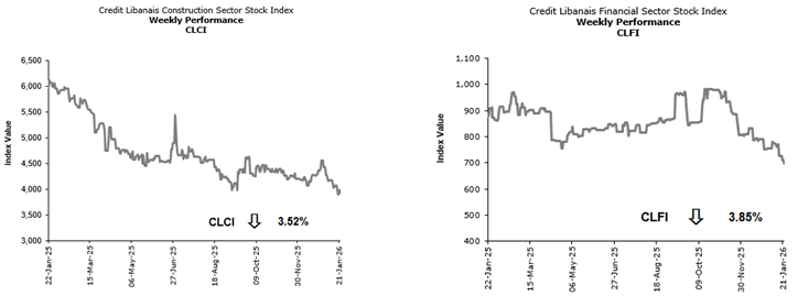 In the real estate sector, trades were mainly concentrated in Solidere “A” and “B” shares (20.40% of weekly traded volume) with the price of Solidere “A” dropping by 4.63% w-o-w to $71.00 and that of Solidere “B” decreasing by 3.05% to $70.00. Consequently, the Credit Libanais Construction Sector Stock Index (“CLCI”) ended Friday’s session down by 3.52% on a weekly basis at 3,932.21.