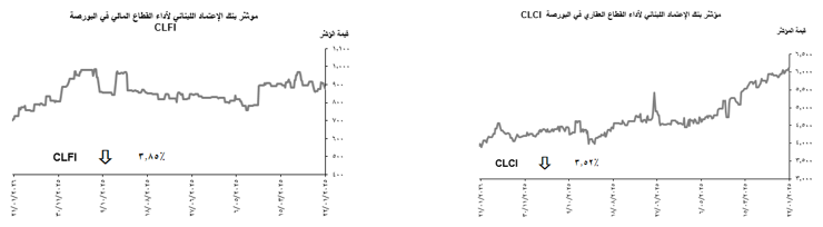أمّا في القطاع المصرفي، فقد إستحوذت الأسهم المدرجة التابعة لبنك عوده على حصّة الأسد (42.17%) من مجموع عدد الأسهُم المتداوَلة خلال الأسبوع المعني. من جهته، أنهى مؤشِّر بنك الإعتماد اللبناني لأداء القطاع المالي في البورصة (“CLFI”) أسبوعه متراجعاً بنسبة 3.85% عن إقفال الأسبوع السابق ليستقرّ عند مستوى 698.62 في ظلّ إنخفاض سعر الأسهم المدرجة التابعة لبنك عوده بنسبة 20.67% إلى 1.19 د.أ. ما طغى على الإرتفاع في سعر الأسهم المدرجة التابعة لبنك لبنان والمهجر بنسبة 2.38% إلى 6.87 د.أ.