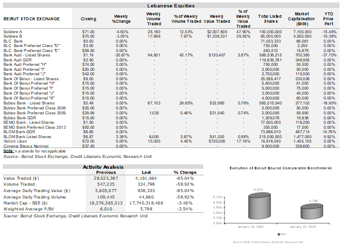 Activity on the Beirut Stock Exchange (BSE) was slow during the week of January 23 with the number of shares changing hands dropping to 224,798 shares compared to 547,225 shares in the week before and value traded decreasing to $4.19 million compared to $28.03 million a week earlier. Trades were concentrated in banking sector stocks, which accounted for 75.15% of weekly traded volume.