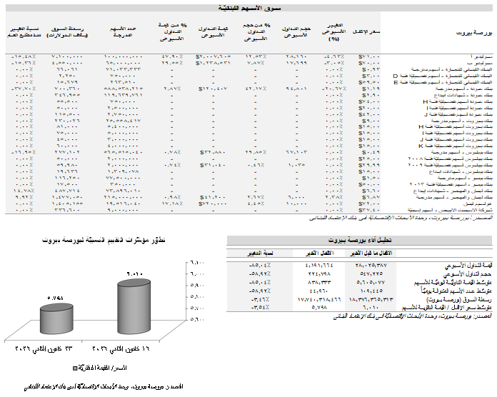 كانت حركة التداول على بورصة بيروت خجولة في الأسبوع المنتهي في 23 كانون الثاني حيث إنخفض عدد الأسهُم المتداوَلة إلى 224،798 سهم، مقارنةً ب547،225 سهم في الأسبوع الذي سبقه رافقه تراجع في قيمة الأسهم المتداولة إلى 4.19 مليون د.أ.، مقارنةً ب28.03 مليون د.أ. قبل أسبوع. وقد سَيطَرَت أسهُم القطاع المصرفي على الحصّة الأكبر من حجم التداول مشكّلةً نسبة 75.15% من مجموع عدد الأسهم المتداولة.