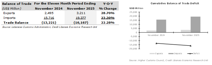 On the current account side of the balance of payments, Lebanon’s balance of trade deficit widened by $2.95 billion (22.28%) y-o-y in the first eleven months of 2025 to around $16.17 billion at end of November, up from around $13.22 billion in the same period in 2024, according to statistics published by the Lebanese Customs Administration. Said rise in the deficit was triggered by some $3.66 billion increase (23.30%) in imports to just below $19.38 billion, which totally eroded the $716.04 million annual increase (28.70%) in exports to $3.21 billion.