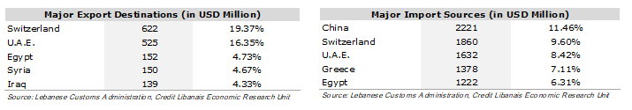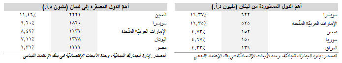 وقد تصدَّرَت سويسرا لائحة الدول المستورِدة من لبنان، مع فاتورة إستيرادٍ وَصَلَت إلى 622 مليون د.أ. (أي 19.37% من مجموع الصادرات اللبنانيّة)، في حين حَلَّت الصين في المرتبة الأولى على لائحة الدول المصدِّرة إلى لبنان حيث وَصَلَت فاتورة صادراتها إلى 2.22 مليار د.أ. (أي 11.46% من فاتورة الإستيراد).