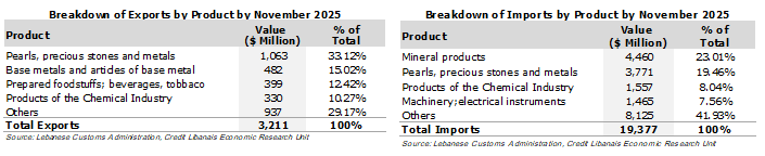 Exports of “pearls, precious stones and metals” accounted alone for 33.12% ($1,063 million) of total Lebanese exports up to November 2025, followed by “base metals and their products” ($482 million <15.02%>), “prepared foodstuffs; beverages & tobacco” ($399 million <12.42%>), and products of the chemical industry” ($330 million <10.27%>). On the other hand, “mineral products” constituted the lion’s share of imported goods ($4,460 million <23.01%>), trailed by “pearls, precious stones and metals” ($3,771 million <19.46%>), “products of the chemical industry” ($1,557 million <8.04%>), and “machinery and electrical instruments” ($1,465 million <7.56%>).