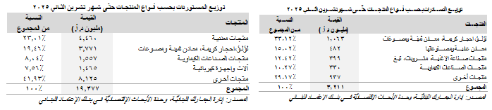 وقد إحتَلَّت صادرات "اللؤلؤ، الأحجار الكريمة، المعادن الثمينة والمصوغات" المرتبة الأولى على لائحة السلع المصدَّرة من لبنان، مشكِّلةً حصّة 33.12% (1،063 مليون د.أ.) من مجموع الصادرات اللبنانيّة حتّى شهر تشرين الثاني 2025، تلتها صادرات "المعادن العاديّة ومصنوعاتها" (482 مليون د.أ. <15.02%>)، و"منتجات صناعة الأغذية والمشروبات والتبغ" (399 مليون د.أ. <12.42%>) ومن ثمّ "منتجات الصناعات الكيماويّة" (330 مليون د.أ. <10.27%>). في المقابِل، أتت "المنتجات المعدنيّة" في المرتبة الأولى (4،460 مليون د.أ. <23.01%>) على لائحة السلع التي إستوردها لبنان، تبعتها مستوردات "اللؤلؤ، والأحجار الكريمة، والمعادن الثمينة والمصوغات" (3،771 مليون د.أ. <19.46%>)، و"منتجات الصناعات الكيماويّة" (1،557 مليون د.أ. <8.04%>) و"الآلات والأجهزة الكهربائيّة" (1،465 مليون د.أ. <7.56%>).