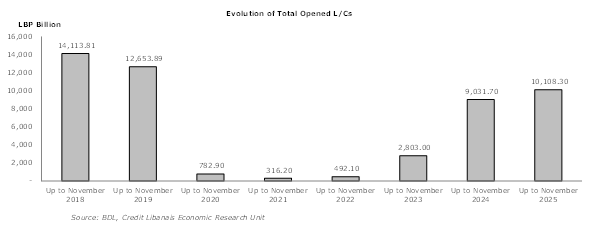According to Banque Du Liban statistics, opened letters of credit (L/Cs), a measurement tool for trade activity, fell by 64.94% during the month of November 2025 to reach LBP 583.60 billion, down from LBP 1,664.60 billion a month earlier. On an annual basis, however, the face value of opened L/Cs reached LBP 10,108.30 billion (around $112.94 million) during the first eleven months of 2025 compared to LBP 9,031.70 billion in the same period in 2024.