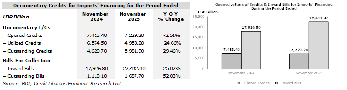Documentary L/Cs opened to finance imports activities reached LBP 7,229.20 billion ($80.77 million) YTD November 2025, compared to LBP 7,415.40 billion in the equivalent period in 2024. Similarly, utilized credits for imports came in lower at LBP 4,953.20 billion ($55.34 million) while inward bills for collection, another documentary credit form of financing (backed by invoices), rose by 25.02% to LBP 22,412.40 billion ($250.42 million) YTD November 2025, from LBP 17,926.80 billion in the same period in 2024.