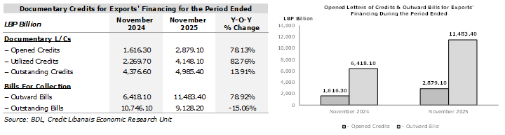 In a related note, documentary L/Cs opened to finance exports activities rose to LBP 2,879.10 billion ($32.17 million) YTD November 2025, up from LBP 1,616.30 billion in the same period in 2024. Concurrently, utilized credits to finance exports increased to LBP 4,148.10 billion ($46.35 million; 144.08% of opened L/Cs for exports). In parallel, the value of outward bills rose to LBP 11,483.40 billion ($128.31 million) YTD November 2025, while outstanding bills for collection sank to LBP 9,128.20 billion ($101.99 million), from LBP 10,746.10 billion in the first eleven months of 2024.
