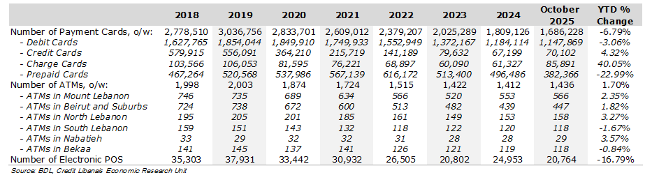 In a related note, the banking sector’s ATM network expanded for the first time since the onset of the crisis in late 2019, increasing by 1.70% (24 ATMs) in the first ten months of 2025 to reach 1,436, compared to 1,412 machines by end of 2024. The Mount Lebanon region amassed the highest concentration of ATMs (566 ATMs <39.42%>), followed by the Beirut and Suburbs (447 ATMs <31.13%>), North (158 ATMs <11.00%>), South & Bekaa (118 ATMs each <8.22%>) and Nabatieh (29 ATMs <2.02%>) regions.