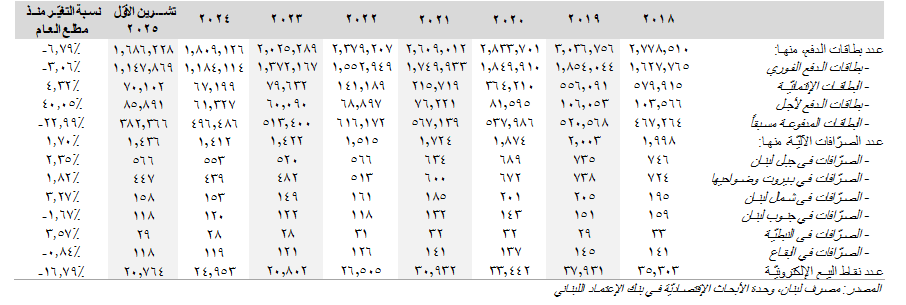 تشير الإحصاءات الصادرة عن مصرف لبنان إلى إنخفاض عدد بطاقات الدفع الإلكترونيّة بنسبة 6.79% (122،898 بطاقة) خلال الأشهر العشرة الأولى من العام 2025 إلى 1،686،228 بطاقة، من 1،809،126 بطاقة في نهاية العام 2024. في التفاصيل، إنخفض عدد بطاقات الدفع الفوري ب36،245 (3.06%) بطاقة إلى 1،147،869 كما وتراجع عدد البطاقات المدفوعة مسبقاً ب114،120 (22.99%) إلى 382،366 بطاقة وهو ما طغى على زيادة عدد البطاقات الإئتمانيّة ب2،903 (4.32%) إلى 70،102 وعدد بطاقات الدفع لأجل ب24،564 بطاقة (40.05%) إلى 85،891. في السياق عينه، تراجع عدد نقاط البيع الإلكترونيّة بنسبة 16.79% (4،189 نقطة بيع) في الأشهر العشرة الأولى من العام 2025 إلى 20،764.