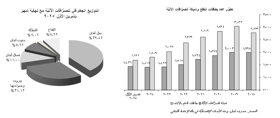 من منظارٍ آخر، زادت شبكة الصرّافات الآليّة للمرّة الأولى منذ بداية الأزمة في نهاية العام 2019 مرتفعةً بنسبة 1.70% )24 صرّاف آلي) في الأشهر العشرة الأولى من العام 2025 إلى 1،436 صرّاف آليّ، مقابل 1،412 صرّاف آليّ في نهاية العام 2024. وقد سيطرت منطقة جبل لبنان على أعلى نسبة تمركزٍ لشبكة الصرّافات الآليّة مع تواجد 566 صرّاف آليّ فيها، أي ما يشكّل 39.42% من مجموع شبكة الصرّافات الآليّة في لبنان، تلتها العاصمة بيروت وضواحيها 447 صرّاف آليّ <31.13%>)، ومنطقة الشمال (158 صرّاف آليّ <11.00%>)، ومنطقتيّ الجنوب والبقاع (118 صرّاف آليّ في كل منهما <8.22%>) والنبطية (29 صرّاف آليّ <2.02%>).