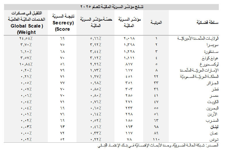 وقد أتى لبنان في المرتبة 68 في العالم والعاشرة في المنطقة في مؤشّر السريّة الماليّة للعام 2025 (مقارنةً بالمرتبة 77 عالميّاً والعاشرة إقليميّاً في النسخة السابقة من التقرير)، محقِّقاً نتيجة 163 (149 سابقاً). وقد سجّل لبنان نتيجة 63 في مؤشّر السريّة الماليّة (64.6 سابقاً)، في حين بقي تثقيله منخفضاً عند 0.46% (0.44% سابقاً) لناحية صادرات الخدمات الماليّة العالميّة. بمعنى آخر، شكّلت صادرات لبنان من الخدمات الماليّة نسبة 0.46% من مجموع الصادرات العالميّة للخدمات الماليّة. وقد سجّل لبنان سريّة كاملة في 9 من أصل 20 مؤشّر، في حين سجّل شفافيّة كاملة في 4 مؤشّرات.