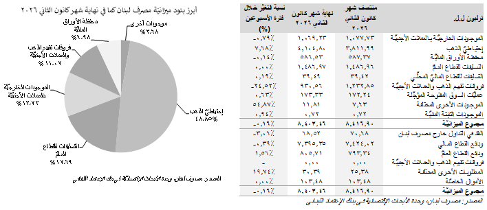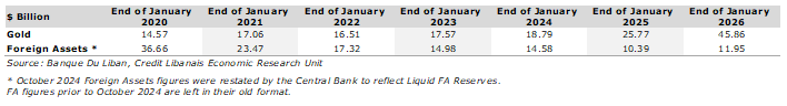 تُظهِر ميزانيّة مصرف لبنان إنخفاض في الموجودات الخارجيّة بالعملات الأجنبيّة بمبلغٍ قدره 94.94 مليون د.أ. (0.79%) خلال النصف الثاني من شهر كانون الثاني 2026 إلى 11.95 مليار د.أ. (1،069.23 ترليون ل.ل.)، مقارنةً مع 12.04 مليار د.أ. (1،077.73 ترليون ل.ل.) قبل فترة أسبوعين. يجدر الذكر أنّ الموجودات الخارجيّة بالعملات الأجنبيّة لدى مصرف لبنان قد شهدت زيادة مضطردة خلال الفترة الممتدّة بين بداية شهر آب 2023 (أيّ عند نهاية ولاية الحاكم السابق رياض سلامة) ونهاية شهر كانون الثاني 2026 بلغت قيمتها الإجماليّة حوالي 3.37 مليار د.أ. عقب سياسة مصرف لبنان النقديّة الجديدة القاضية بالإمتناع عن تسليف الحكومة ورفع الدعم عن معظم السلع والحدّ من طبع العملة المحليّة. في السياق عينه، زادت الموجودات الخارجيّة بالعملات الأجنبيّة لدى مصرف لبنان بحوالي 50 مليون د.أ. منذ مطلع العام الحالي. من جهةٍ أخرى، تُبيِّن ميزانيّة مصرف لبنان زيادة في قيمة إحتياطاته من الذهب بلغت نسبتها 7.68% (3.27 مليار د.أ.) في النصف الثاني من شهر كانون الثاني 2026 إلى 45.86 مليار د.أ. (4،104.80 ترليون ل.ل.) في ظلّ إرتفاع أسعار الذهب إلى أعلى مستوى تاريخي لها نتيجة حالة عدم اليقين حول قوّة الدولار الأميركي وإستمرار التوتّرات الجيوسياسيّة.