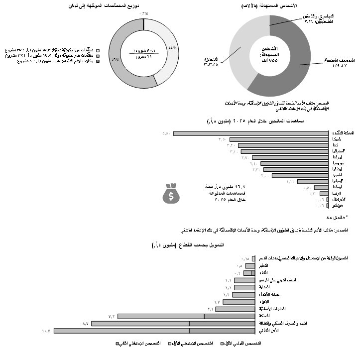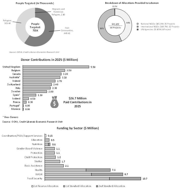 خصّص الصندوق الإنساني للبنان مبلغ 35.1 مليون د.أ. خلال العام 2025 للمساعدة في معالجة الأزمة الإنسانيّة الراهنة في البلاد. يستهدف التمويل حوالي 755 ألف شخص، موزّعين على 2.16 ألف مهاجر ولاجئ فلسطيني و303.48 ألف لاجئ و449.42 ألف مجتمعات مضيفة. في الإطار نفسه، فإنّ 31% من الأشخاص المستهدفة هي نساء (231.89 ألف) و29% هم رجال (218.45 ألف) و20% من الفتيات (153.08 ألف) و20% من الفتيان (151.63 ألف). وبحسب الصندوق الإنساني للبنان، توزّع مبلغ ال35.1 مليون د.أ. على ثلاثة شرائح: الأولى وهبتها منظّمات غير حكوميّة محليّة وتبلغ قيمتها 15.3 مليون د.أ. وقسّمت على 35 مشروع والثانية مصدرها منظّمات غير حكوميّة دوليّة وبلغت قيمتها الإجماليّة 19.7 مليون د.أ. وتوزّعت على 32 مشروع والثالثة من قبل وكالات الأمم المتّحدة وبلغت قيمتها 0.15 مليون د.أ. وإستهدفت مشروع واحد. وبحسب الصندوق الإنساني للبنان، فإنّ مبلغ 26.7 مليون د.أ. من أصل المخصّصات البالغة 35.1 مليون د.أ. قد تمّ دفعه في العام 2025. وقد برزت المملكة المتّحدة كالمانح الأكبر (5.50 مليون د.أ.) لجهة المخصّصات المدفوعة في العام 2025 تبعتها بلجيكا (3.50 مليون د.أ.) وكندا (3.20 مليون د.أ.) وأستراليا (3.20 مليون د.أ.) وإيرلندا (2.70 مليون د.أ.) للذكر لا الحصر. بالإضافة إلى ذلك، فإنّ القطاعات التي إستفادت من التمويل المذكور شملت قطاع الأمن الغذائي (10.7 مليون د.أ.) والمياه والصرف الصحّي والنظافة (8.7 مليون د.أ.) والصحّة (7.3 مليون د.أ.) والحاجات الأساسيّة (2.1 مليون د.أ.) للذكر لا الحصر.