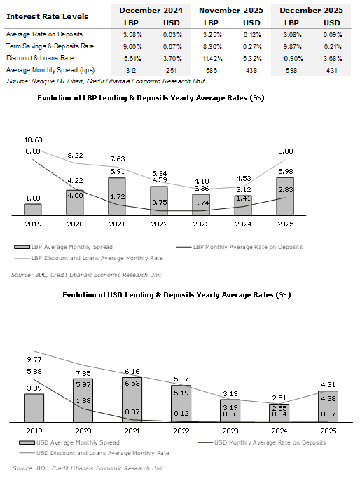 According to BDL statistics, the average interest rate on Lebanese Pound denominated deposits rose to 3.68% during the last month of 2025, up from 3.25% in the previous month, noting that it stood at 3.58% in December 2024. Conversely, the average interest rate on U.S. Dollar denominated deposits decreased to 0.09% in December 2025, down from 0.12% in November of the same year noting that it stood at 0.03% in December 2024. Commercial banks’ discount and lending rate on LBP denominated loans dropped to 10.90% in December 2025 (11.42% in November), with that on USD denominated loans concurrently decreasing to 3.68% (5.32% in November). Consequently, the average monthly spread between LBP lending and deposit rates widened to 598 basis points in 2025 (586 bps YTD November), while that between USD lending and deposit rates narrowed to 431 bps (438 bps by November). It is worth noting that the average annual interest rate paid on LBP deposits rose to 2.83% in the full year 2025 from 1.41% in 2024 and 0.74% in 2023. Similarly, the average annual interest rate paid on USD deposits rose to 0.07% in 2025 from 0.04% in 2024 and 0.06% in 2023.