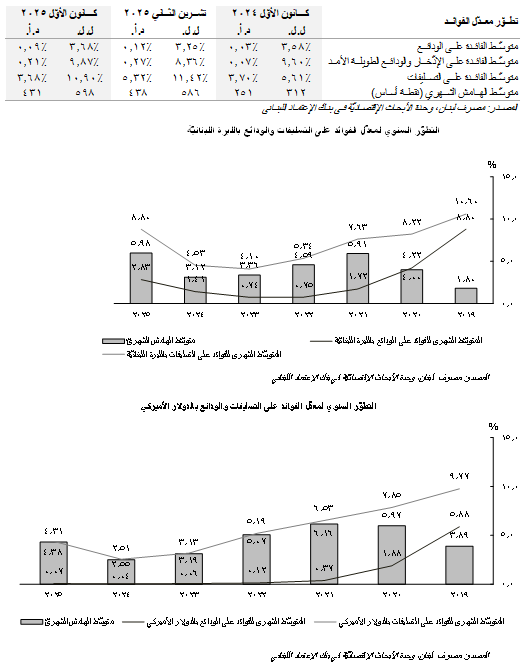 بحسب إحصاءات مصرف لبنان، إرتفع متوسّط الفائدة على الودائع المعنونة بالليرة اللبنانيّة إلى 3.68% خلال الشهر الأخير من العام 2025، من 3.25% في الشهر الذي سبقه، علماً أنّه كان قد إستقرّ عند مستوى 3.58% في شهر كانون الأوّل من العام 2024. من جهةٍ أخرى، تراجع متوسّط الفائدة على الودائع بالدولار الأميركي إلى 0.09% في شهر كانون الأوّل 2025 من 0.12% في شهر تشرين الثاني من العام نفسه، علماً أنّه كان قد أنهى الشهر الأخير من العام 2024 عند 0.03%. في إطارٍ متصّل، إنخفض متوسّط الفائدة على التسليفات المُعَنونة بالليرة اللبنانيّة إلى 10.90% في شهر كانون الأوّل 2025 (11.42% في تشرين الثاني)، كما وتراجع متوسّط الفائدة على التسليفات المُعَنونة بالدولار الأميركي إلى 3.68% (5.32% في تشرين الثاني). نتيجةً لذلك، إتّسع متوسّط الهامش الشهري إلى 598 نقطة أساس ما بين التسليفات والودائع بالليرة اللبنانيّة كما في نهاية العام 2025 (586 نقطة أساس حتّى شهر تشرين الثاني) فيما إنخفض إلى 431 نقطة أساس ما بين التسليفات والودائع بالدولار الأميركي (438 نقطة أساس لغاية شهر تشرين الثاني). يجدر الإشارة إلى أنّ المتوسّط السنويّ للفائدة المدفوعة على الودائع بالليرة اللبنانيّة قد إرتفع إلى 2.83% في كامل العام 2025 من 1.41% في العام 2024 و0.74% في العام 2023. بالتوازي، زاد المتوسّط السنويّ للفائدة المدفوعة على الودائع بالدولار الأميركي إلى 0.07% في العام 2025 من 0.04% في العام 2024 و0.06% في العام 2023.