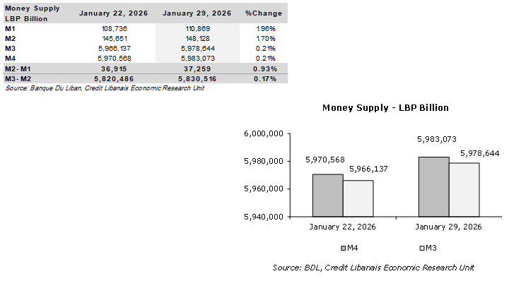 All monetary aggregates ended the week of January 29, 2026 on a positive note. In fact, the overall money supply, “M4”, widened by LBP 12,504.99 billion on a weekly basis to LBP 5,983.07 trillion, noting that the non-banking sector’s Treasury bills portfolio decreased by LBP 1.67 billion during the concerned week.