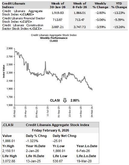 Three losing and no gaining stocks were screened week-on-week, dragging the BSE’s market capitalization down by 2.70% to around $17.19 billion and the Credit Libanais Aggregate Stock Index (“CLASI”) lower by 2.80% to 1,866.01.
